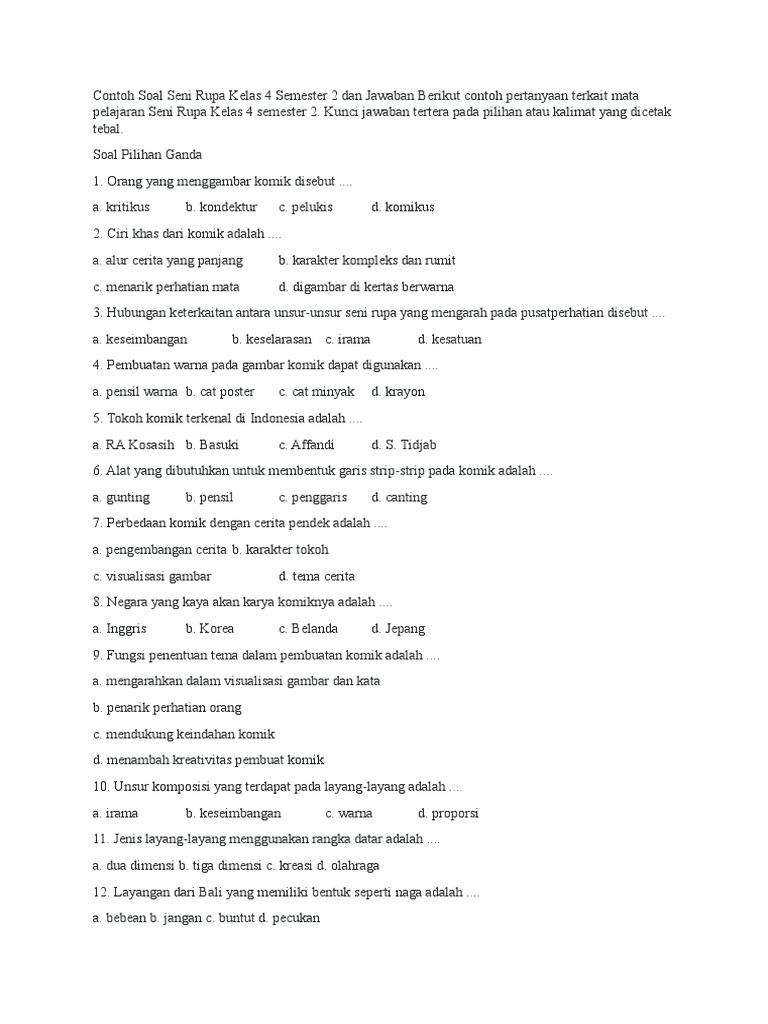 Seni rupa, sebagai mata pelajaran yang merangsang imajinasi, apresiasi, dan keterampilan teknis, menjadi salah satu mata pelajaran yang menarik bagi siswa kelas XI. Semester pertama di tingkat ini biasanya menjadi fase penting untuk memperdalam pemahaman tentang berbagai konsep seni, teknik berkarya, serta sejarah dan apresiasi seni. Artikel ini akan menyajikan serangkaian contoh soal yang mencakup berbagai aspek seni rupa yang umum diajarkan di kelas XI semester 1, lengkap dengan penjelasan untuk membantu siswa mempersiapkan diri dan menguji pemahaman mereka.